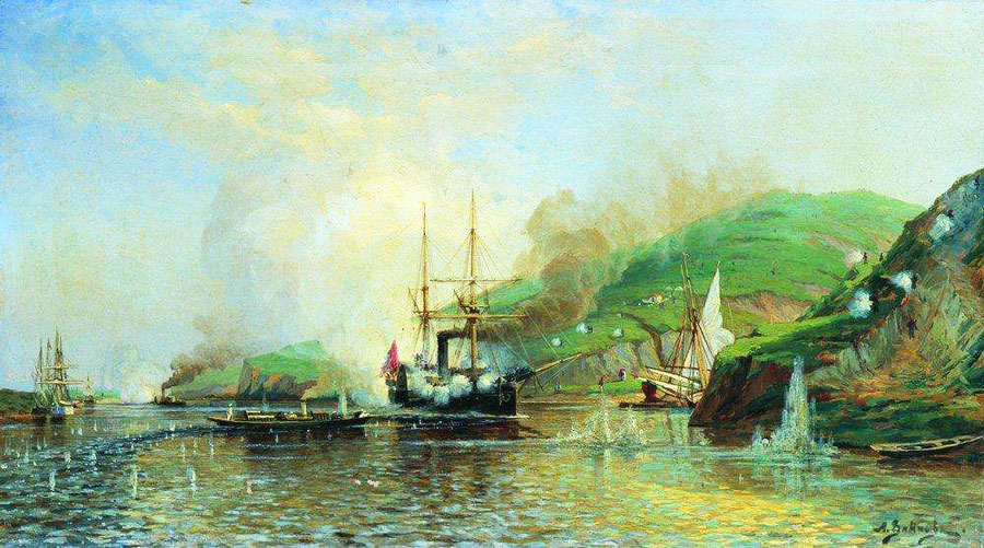 Боголюбов Алексей Петрович. “Атака катера Шутка турецкого парохода на Дунае 14 мая 1877 года“ (1882 г.).*.jpg, 900×501, 164 Kb