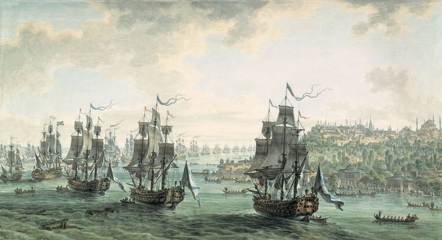 Иванов Михаил Матвеевич. “Российская эскадра под командованием Ф.Ф. Ушакова, идущая Константинопольским проливом“.*.jpg, 900×488, 106 Kb