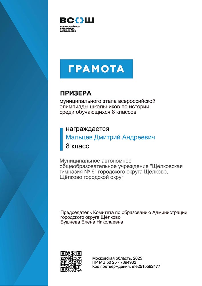 Мальцев Дмитрий Андреевич, обучающийся 8 класса, Призёр муниципального этапа Всероссийской олимпиады школьников по истории среди обучающихся 8 классов (ПР МЭ 50 25-7394932. Код подтверждения: me2515592477 Дата проведения 06.11.2025).