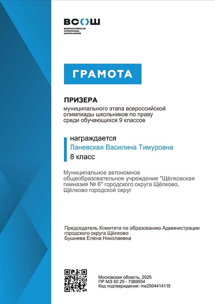 Ланевская Василина Тимуровна, обучающаяся 8 класса, Призёр муниципального этапа Всероссийской олимпиады школьников по праву среди обучающихся 9 классов (ПР МЭ 50 25-7369554. Код подтверждения: me2504414115 Дата проведения 16.10.2025).