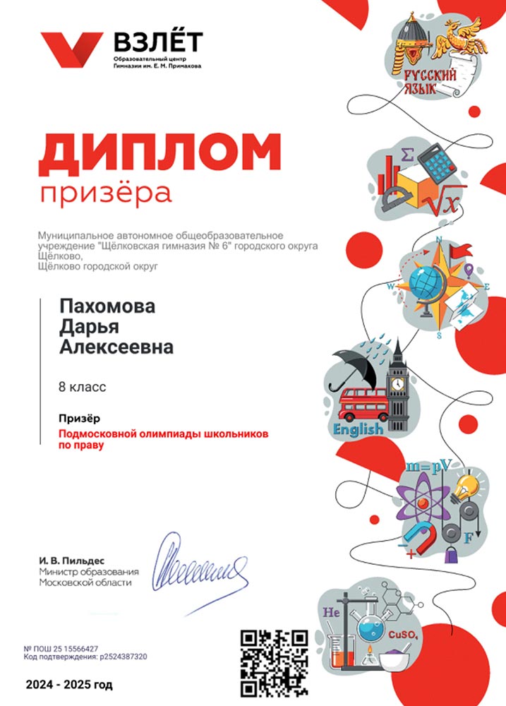 Грамота Министерства образования Московской области. Награждается Пахомова Дарья Алексеевна, 8 класс, Победитель регионального этапа Всероссийской олимпиады школьников по праву среди 9 классов (ПО РЭ 50 25-5199691. Код подтверждения: r2553889448 Дата проведения 04.02.2025).