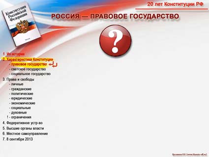 Презентация записана в самозапускающемся формате PPS. В левой части окна имеется активная панель меню, на которой отображается активный слайд, значком у выделенного слайда отмечено количество анимаций (переходов) внутри слайда. Каждый пункт меню является гиперссылкой и позволяет переходить к любому пункту презентации. Переход на титульный лист производится через гиперссылку в правом верхнем углу на названии темы «20 лет Конституции РФ».