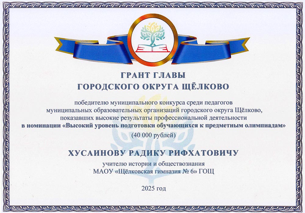 Грант Главы городского округа Щёлково «победителю муниципального конкурса среди педагогов общеобразовательных организаций городского округа Щёлково, показавших высокие результаты профессиональной деятельности в номинации "Высокий уровень подготовки обучающихся к предметным олимпиадам"».(03.10.2025) |