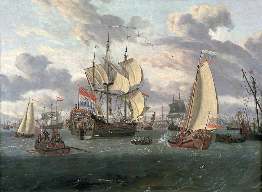 © http://windgammers.narod.ru/Korabli/Petr-i-Pavel.html В марте 1697 г. Пётр I под именем Петра Михайлова отправился в составе «великого посольства» в Голландию, Англию и Венецию. Поездка продолжалась около полутора лет. Первое время Пётр I работал в Амстердаме простым плотником на верфи Ост-Индской компании под руководством известного в те времена корабельного мастера Класа Поля. Четыре с половиной месяца усердно трудился русский царь у корабельного мастера, изучил всё, что только мог, узнал все хитрости сложной специальности. Клас Поль был очень доволен работой царя-плотника, о чём красноречиво свидетельствует аттестат, выданный им Петру I: «Я, нижеподписавшийся, Геррит Клас Поль, корабельный мастер при Амстердамской камере привилегированной Ост-Индской компании, свидетельствую и удостоверяю по истине, что Пётр Михайлов (находящийся в свите великого московского посольства в числе тех, которые здесь, в Амстердаме, на Ост-Индской корабельной верфи с 30 августа 1697 г. по нижеуказанное число жили и под нашим руководством плотничали) во времена благородного здесь пребывания своего был прилежным и разумным плотником, также в связывании, заколачивании, сплачивании, поднимании, прилаживании, натягивании, плетении, конопачении, стругании, буравлении, распиловании, мощении и смолении поступал, как доброму и искусному плотнику надлежит, и помогал нам в строении фрегата “Пётр и Павел“, от первой закладки его, длиною в 100 футов (от форштевня до ахтерштевня), почти до его окончания, и не только что под моим надзором корабельную архитектуру и черчение планов его благородие изучил основательно, но и уразумел эти предметы в такой степени, сколько мы сами их разумеем. Для подлинного удостоверения я подписал сие моею собственной рукой. Дано в Амстердаме, в нашем постоянном местопребывании на Ост-Индской верфи, 14 января в лето Господне 1698 г. Геррит Клас Поль, корабельный мастер привилегированной Ост-Индской компании в Амстердаме.» На картине Сторка корабль Петра, находящийся справа, встречает на пути в Англию новенький голландский фрегат “.Пётр и Павел“, в строительстве которого он принимал участие. |