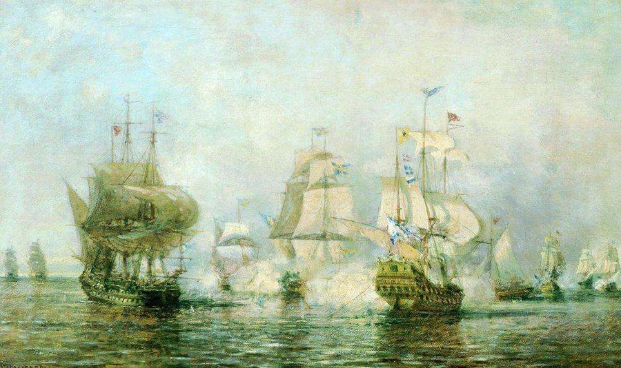 Боголюбов, Алексей Петрович. “Первое сражение русского корабельного флота под командой Сенявина около острова Эзель со шведским флотом 24 мая 1719 г.“ (1866 г.).*.jpg, 900×534, 131 Kb