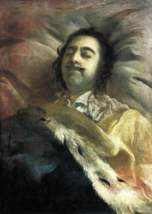 Лежащий царь, прикрытый горностаевой мантией, увиден с необычной точки зрения – сверху, в непривычном сложном освещении от трепещущих свечей, дрожью пламени вносящих жизнь в мёртвое тело. Редкое по живописной силе и свободе полотно – реквием Петру, написанный близким человеком, единомышленником, ошеломленным величиной утраты.